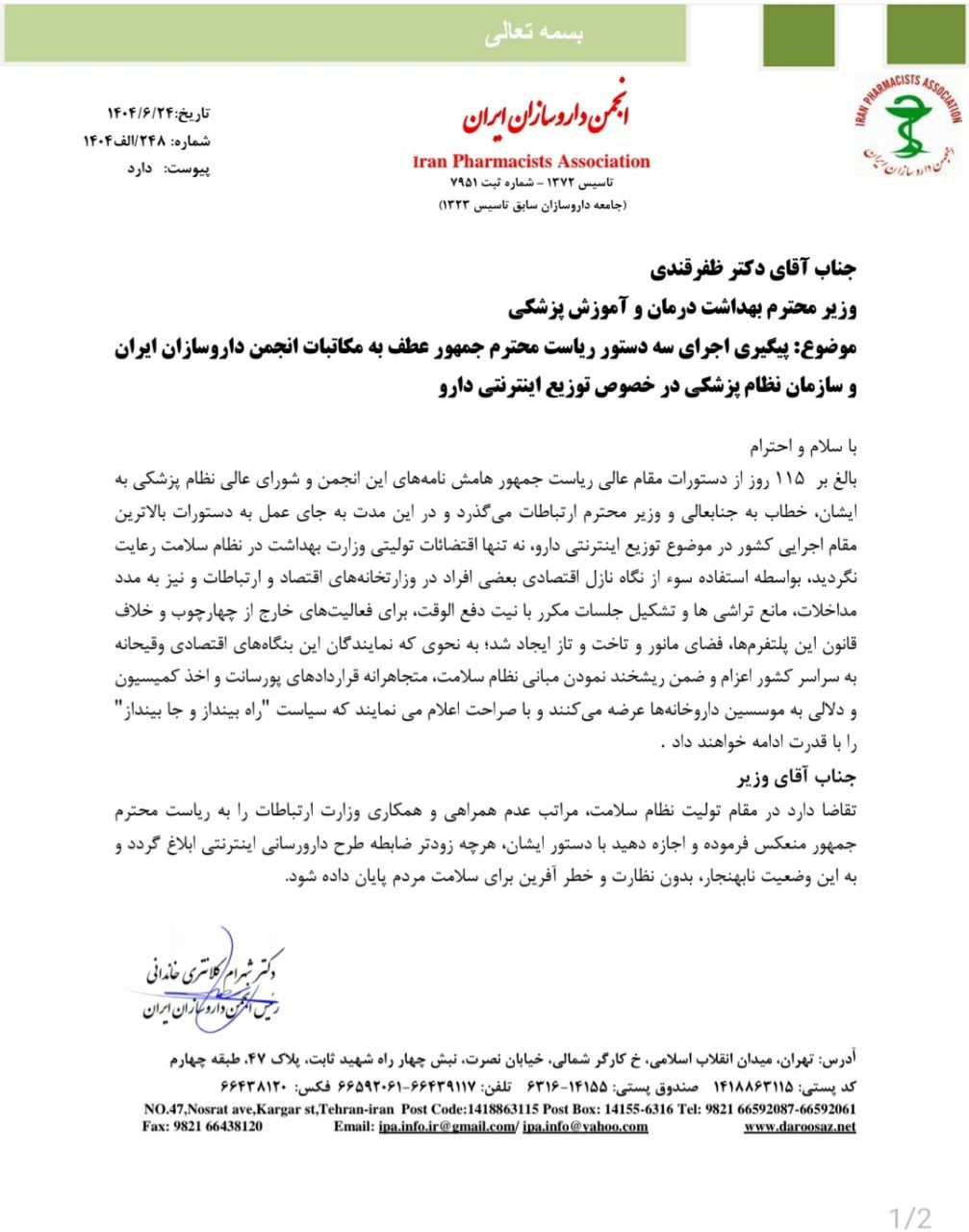 دکتر شهرام کلانتری خاندانی، رئیس انجمن داروسازان ایران، در نامه‌ای به دکتر محمدرضا ظفرقندی، وزیر بهداشت، درمان و آموزش پزشکی، خواستار پیگیری اجرای سه دستور رئیس‌جمهور شد. این درخواست مرتبط با مکاتبات انجمن داروسازان ایران و سازمان‌های نظام پزشکی درباره توزیع اینترنتی دارو است.